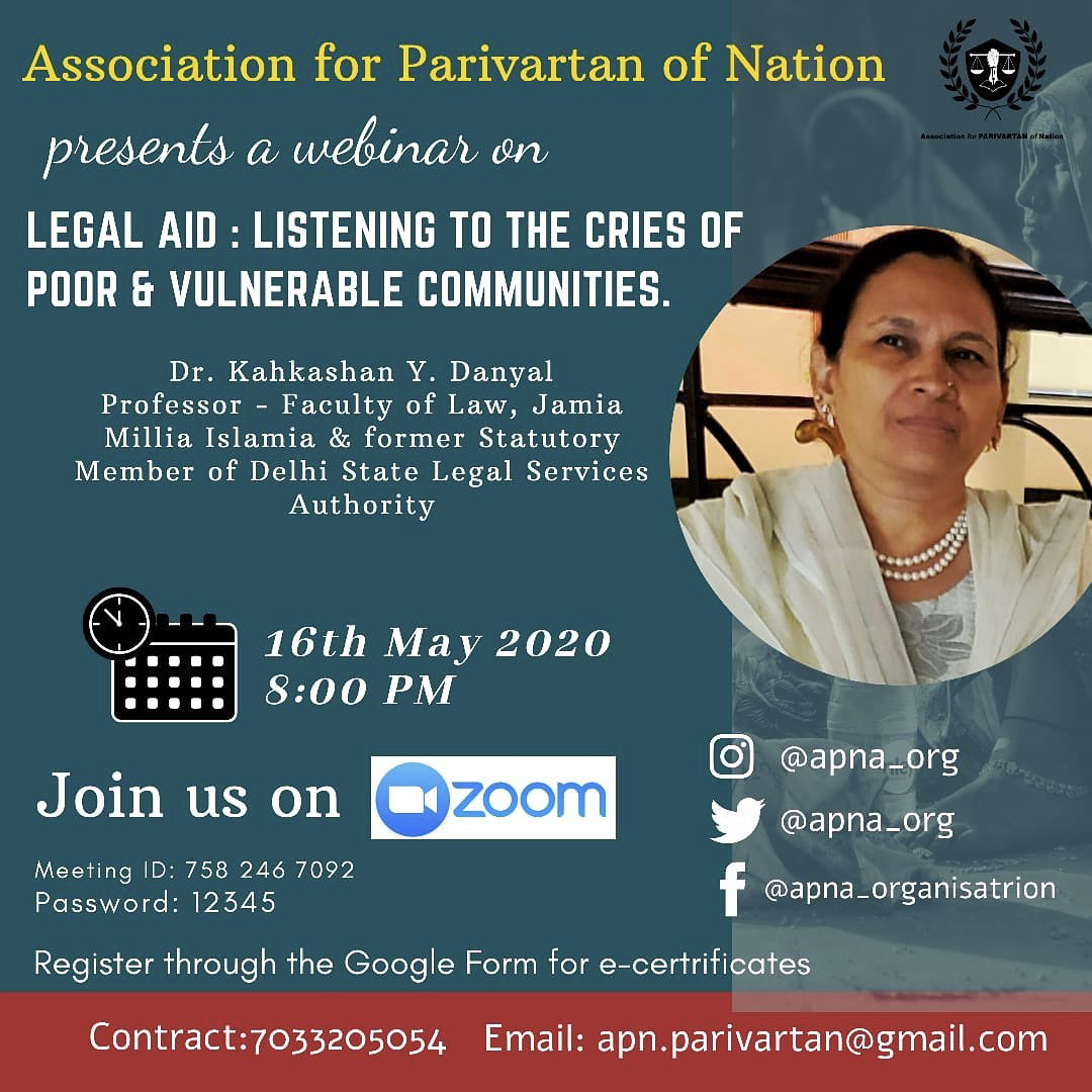 On 16th May 2020, the Association for Parivartan of Nation hosted a powerful live session on the importance of centring the challenges of poor and vulnerable communities in accessing legal aid within the justice system. The event was organised through Cisco Webex and brought together over 120 participants, including law students, grassroots workers, local leaders, and community representatives.